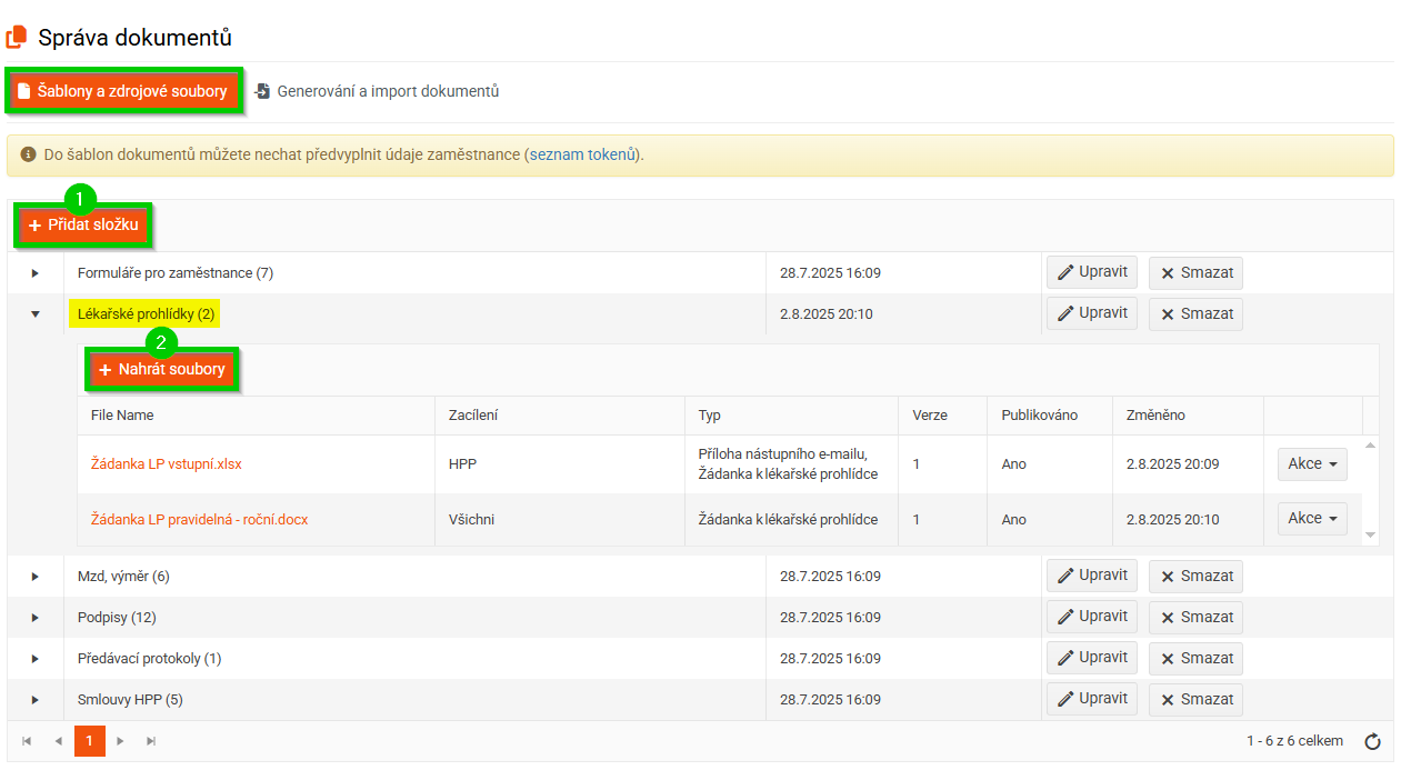 Na kartě Šablony a zdrojové soubory můžete vytvářet složky a vkládat do nich příslušné šablony dokumentů. Novou složku vytvoříte kliknutím na tlačítko Přidat složku (1). Po rozkliknutí dané složky lze nahrávat připravené dokumenty - tlačítko Nahrát soubory (2).