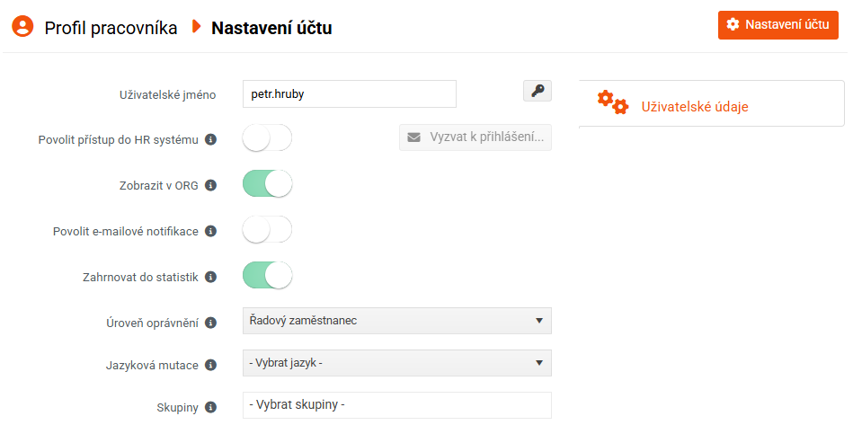 Po opětovné aktivaci budou přepínače v Nastavení účtu nastaveny do stejného stavu, v jakém byly u zaměstnance v době jeho ukončení, tedy v okamžiku aktivace.