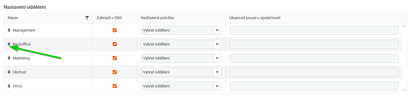 U oddělení můžete navíc nastavit i pořadí jejich zobrazení. Klikněte na šipky vedle názvu oddělení a přetáhněte jej na požadované místo.