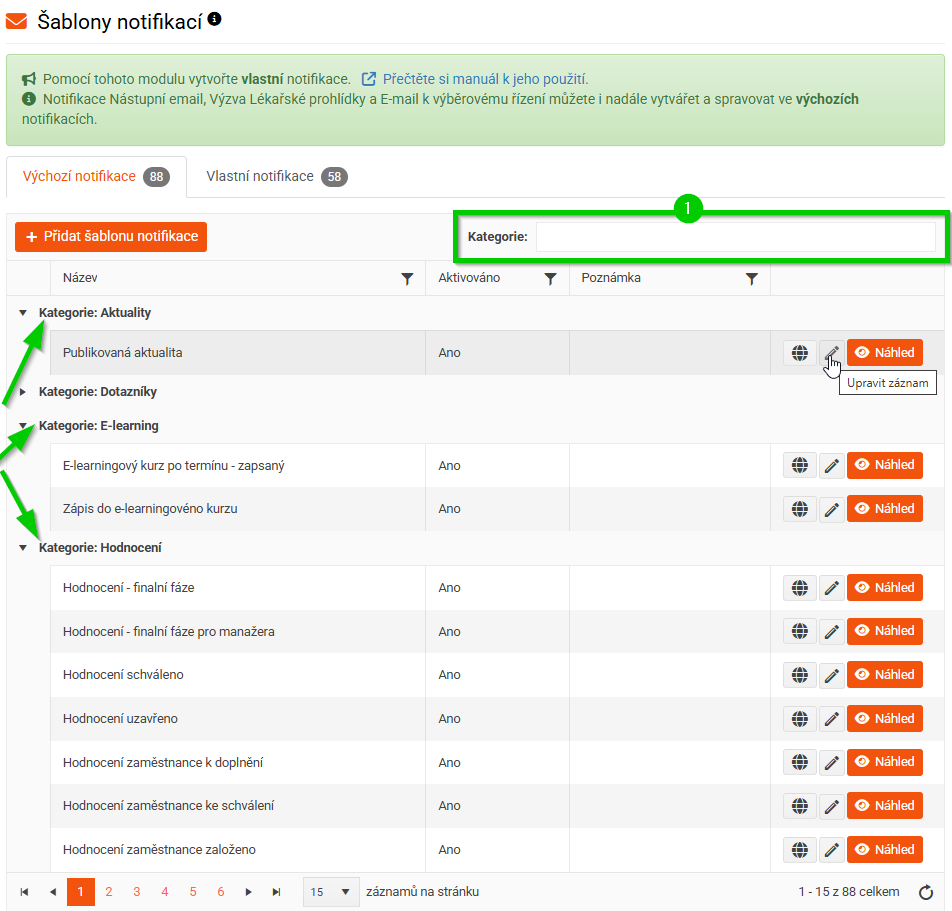 Šablony notifikací jsou pro přehlednost rozděleny do kategorií, které jsou pevně dané. Můžete si je jednoduše vyhledat pomocí filtru Kategorie (1). Kliknutím do pole pro vyhledávání se zobrazí seznam všech kategorií. V poli funguje tzv. našeptávač (začněte psát text a funkce vám automaticky nabídne odpovídající návrhy).