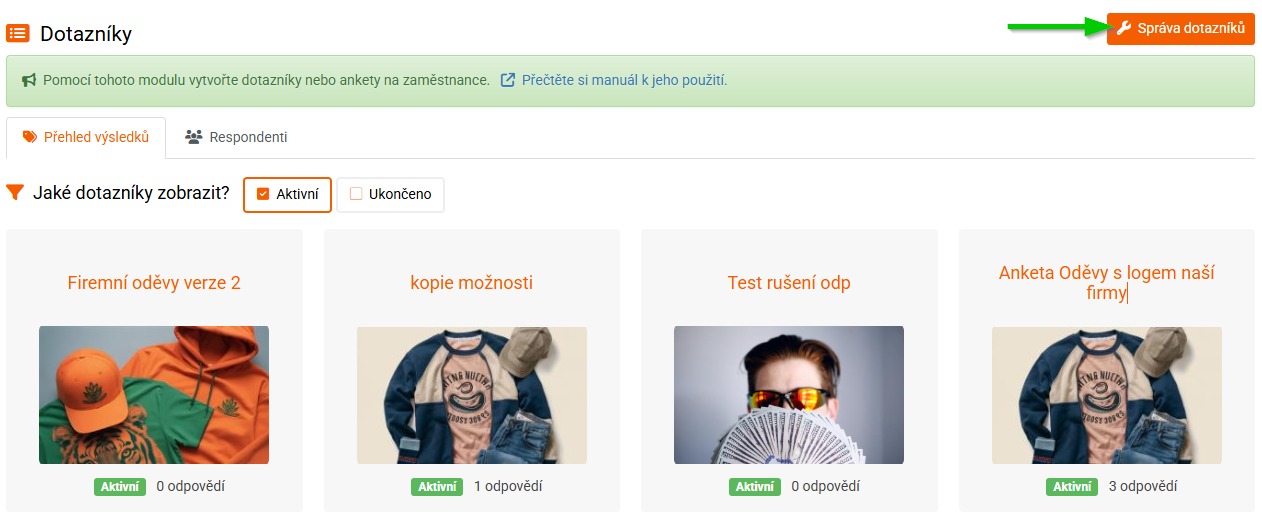Správu dotazníků najdete pod menu HR (na barevné liště) > Dotazníky > tlačítko Správa dotazníků.