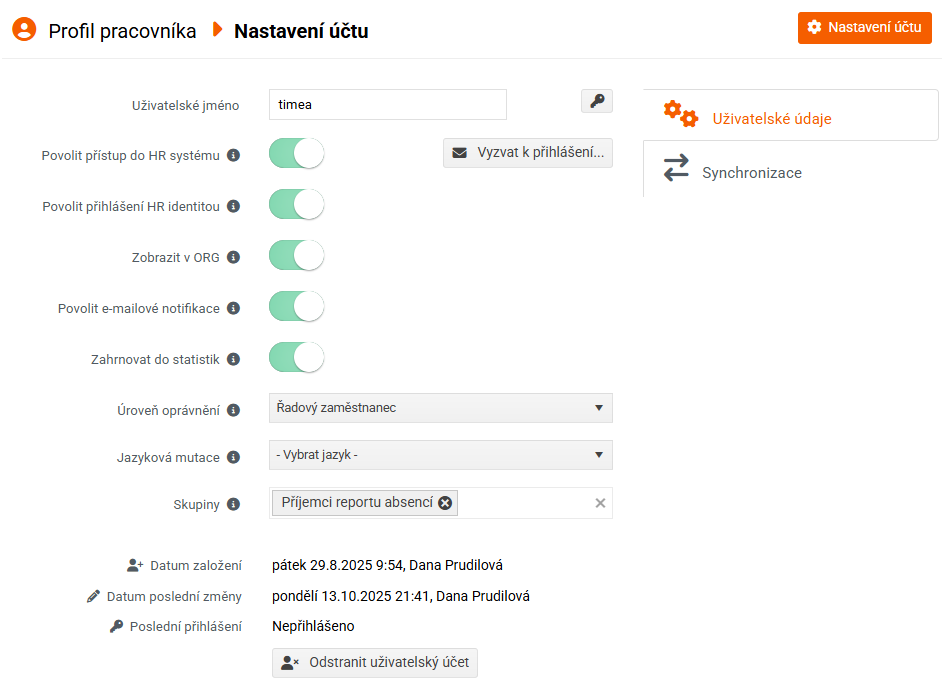 - Povolit přístup do HR systému: Vypnutím tohoto přepínače uživateli znemožníte vstup do systému. Uživatel se do systému nepřihlásí, i když jeho účet je stále aktivní a přístupové údaje jsou stále platné.