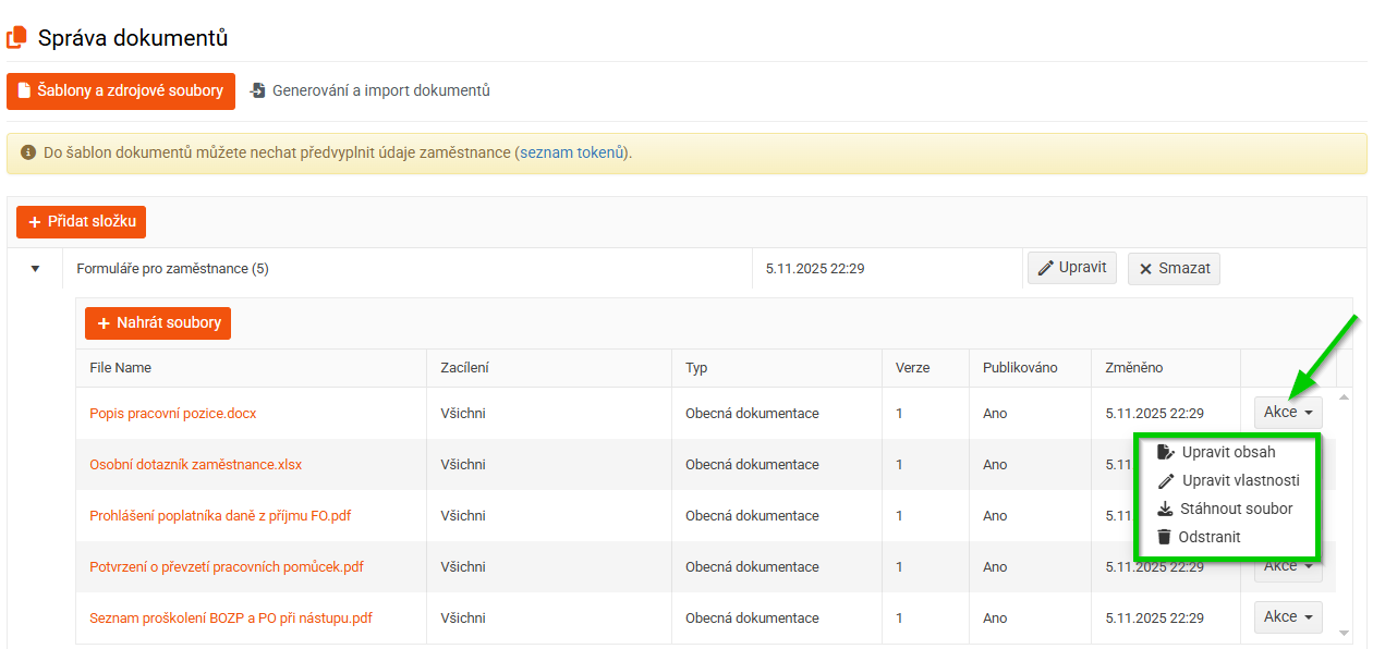 Po nahrání šablony můžete s daným souborem dále pracovat prostřednictvím tlačítka Akce.