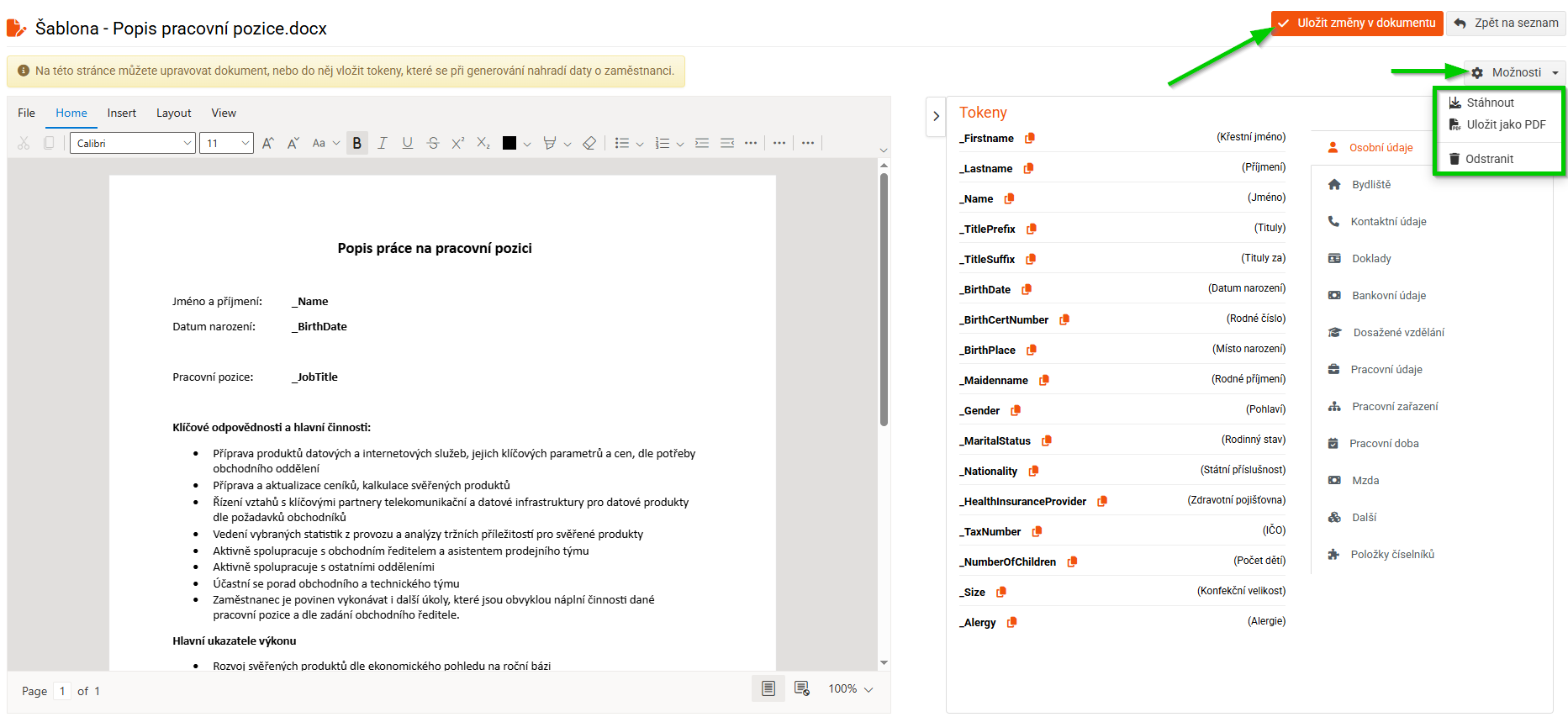 Po vybrání této akce se otevře stránka s online editorem, kde můžete upravovat dokument a vkládat do něj tokeny, které se při generování nahradí daty o zaměstnanci.