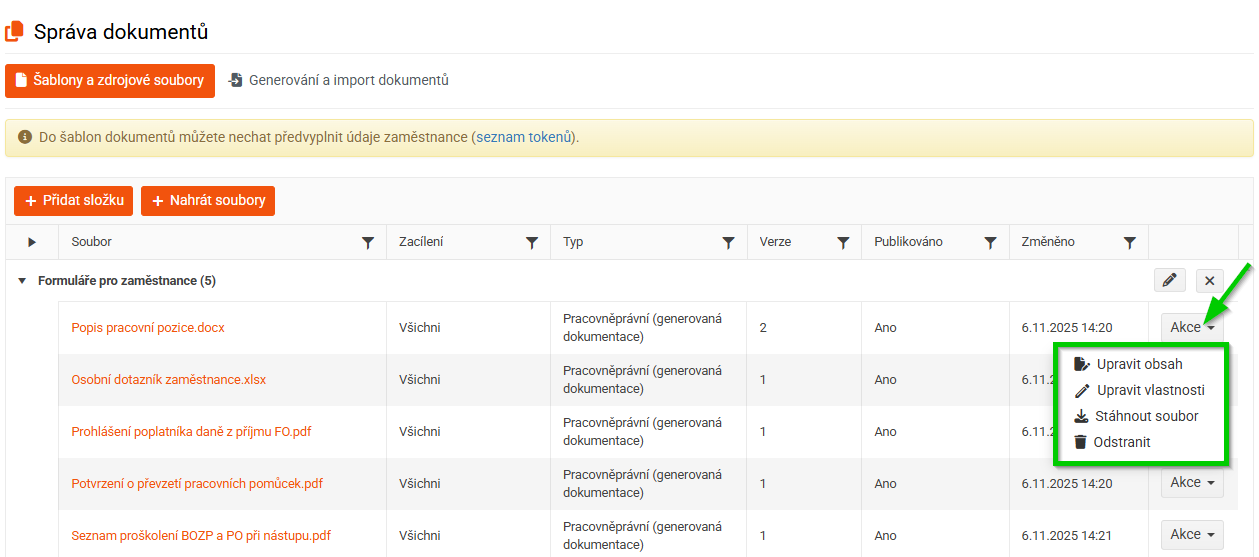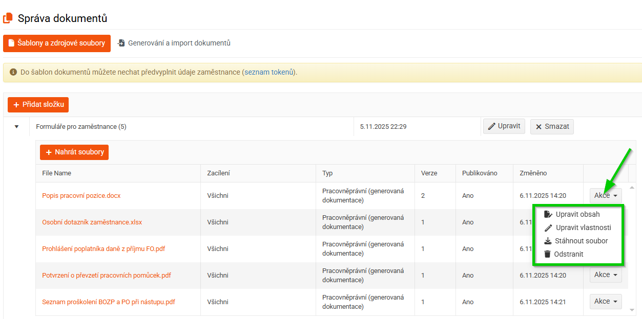Po nahrání šablony můžete s daným souborem dále pracovat prostřednictvím tlačítka Akce.