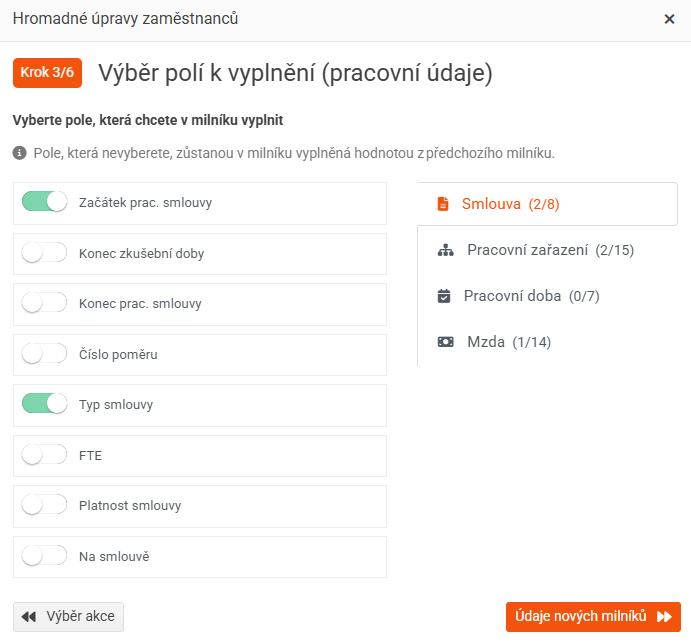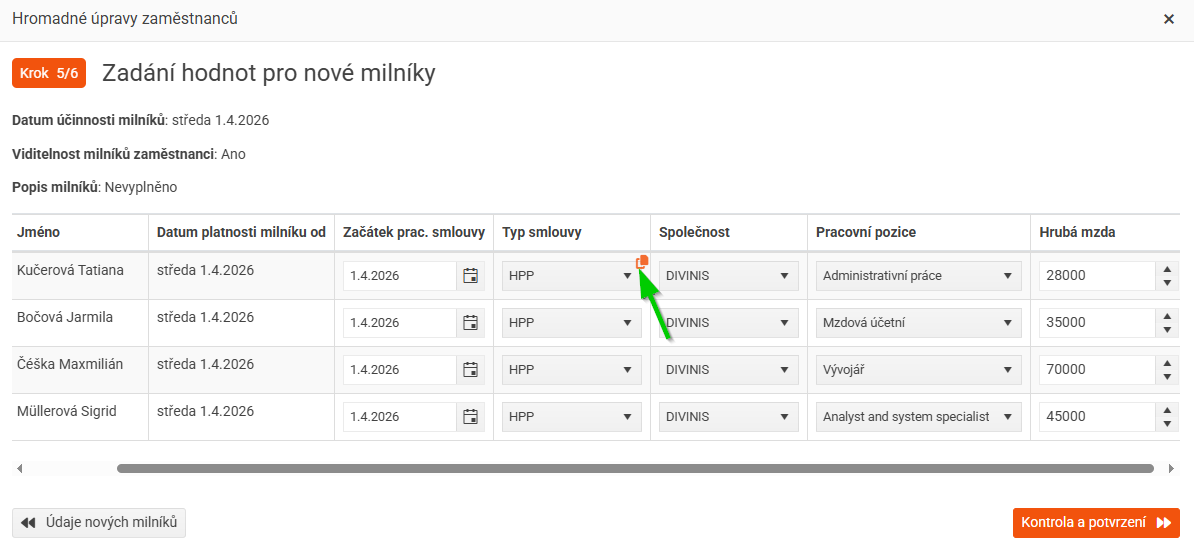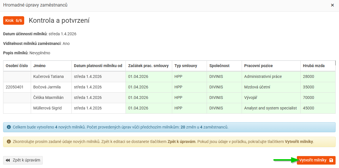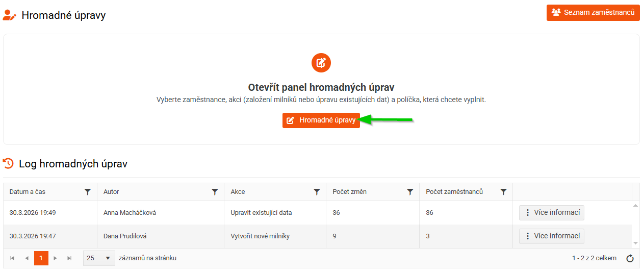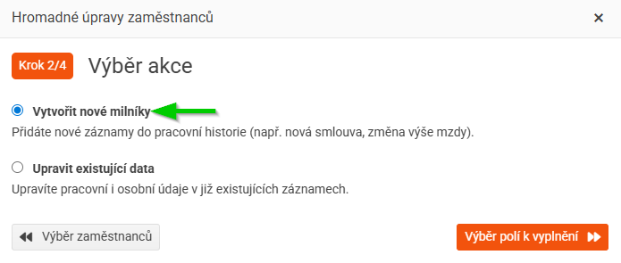 Hromadné zakládání milníků umožňuje přidat nové záznamy do pracovní historie více zaměstnancům najednou.