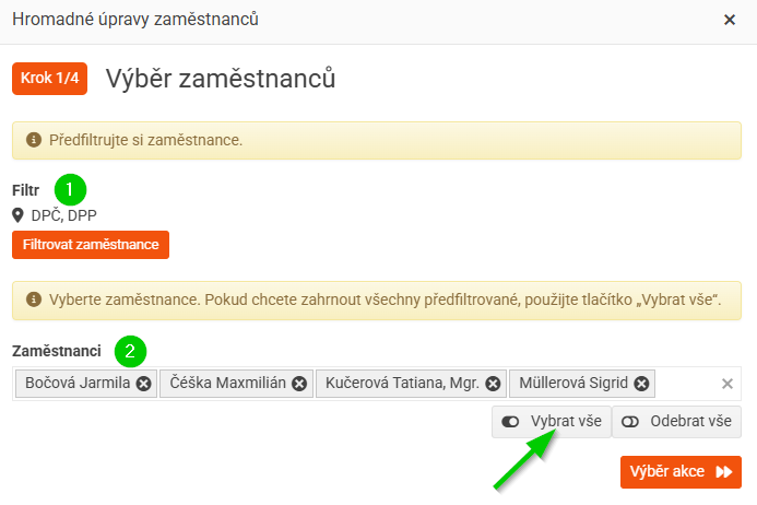 - Vyberte zaměstnance - můžete použít všechny předfiltrované (pomocí tlačítka "Vybrat vše") nebo jejich výběr dále zúžit.