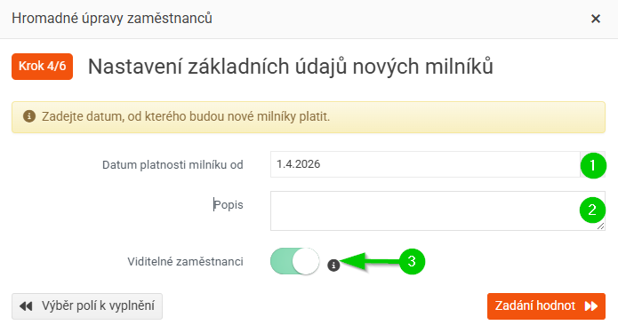 - Viditelné zaměstnanci - viditelnost lze nastavit pouze u budoucích milníků, aktuální i minulé milníky jsou vždy viditelné