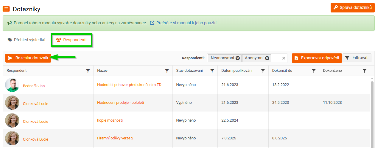 Na hlavní stránce modulu Dotazníky jsou dvě záložky Přehled výsledků a Respondenti.