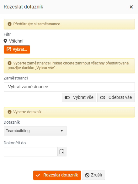 Po kliknutí na tlačítko se zobrazí formulář pro rozeslání dotazníku.