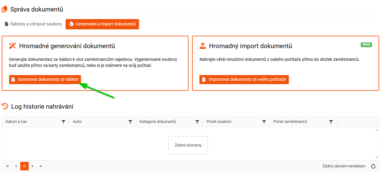 Správa dokumentů > Generování a import dokumentů a kliněte na tlačítko Generovat dokumenty ze šablon.