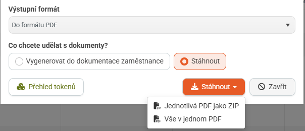 - Co chcete udělat s dokumenty? - zvolte, zda chcete dokumenty vygenerovat do dokumentace zaměstnance, nebo je chcete pouze stáhnout.