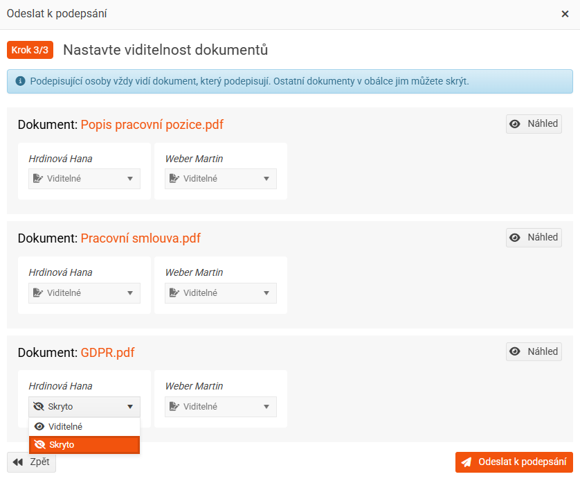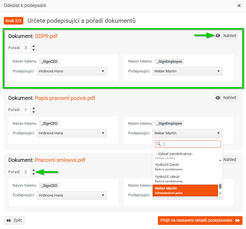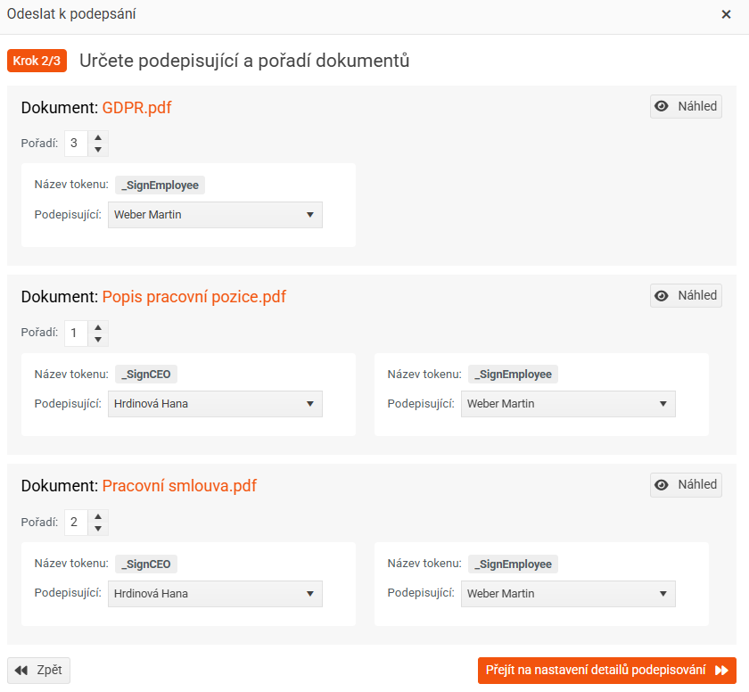 V tomto kroku se zobrazují všechny dokumenty, které jste zvolili k vložení do obálky. Kliknutí na tlačítko Náhled si je můžete zobrazit. U každého z dokumentů vidíte název podpisového tokenu a přiřazenou osobu. V případě potřeby lze místo přednastavené osoby vybrat jiného pracovníka. U každého dokumentu je také možné nastavit jeho pořadí v obálce.