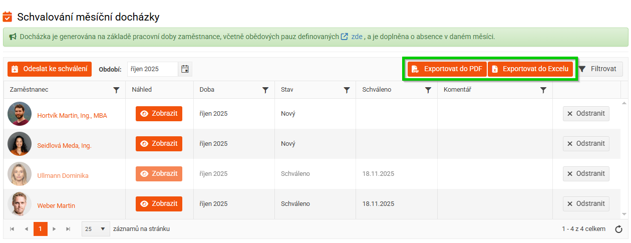 Získáte tak tabulkový přehled zaměstnanců s informacemi o stavu schvalování docházky za příslušný měsíc.