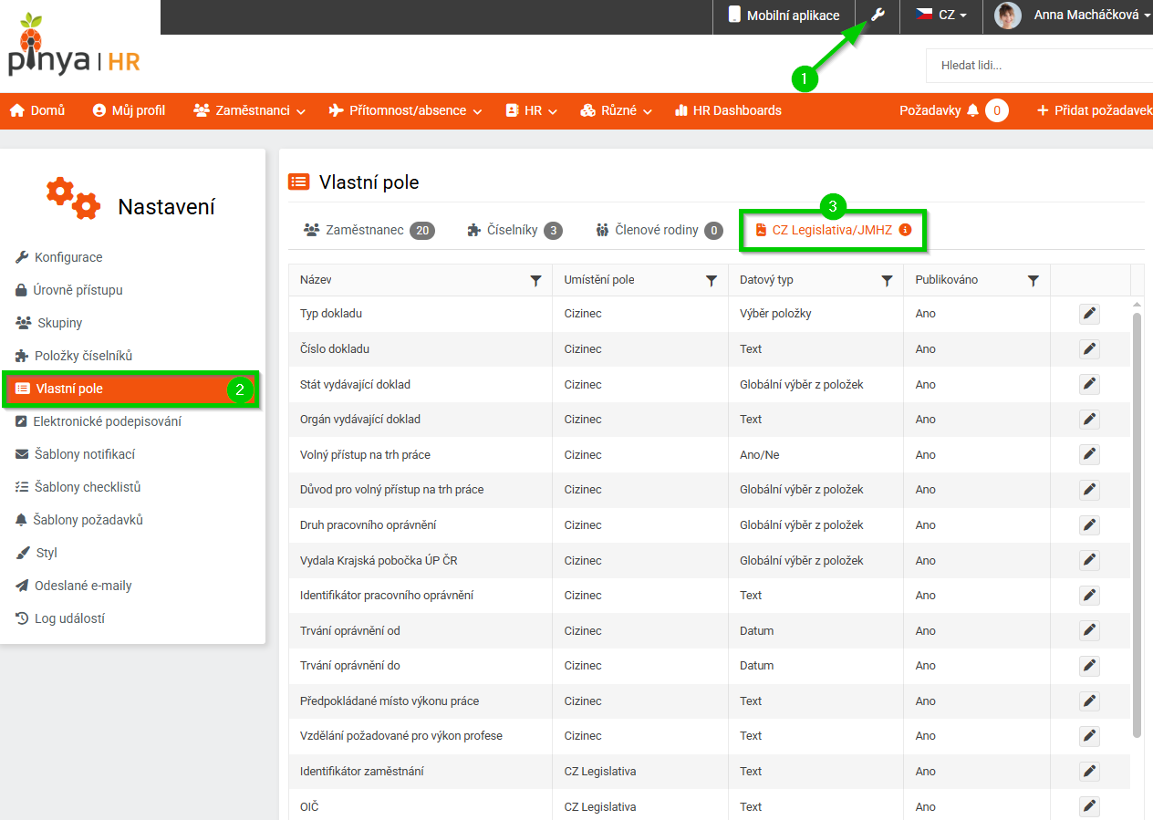 Jednotlivá pole lze po aktivaci dále spravovat a konfigurovat v hlavním nastavení systému > Vlastní pole > CZ Legislativa/JMHZ.