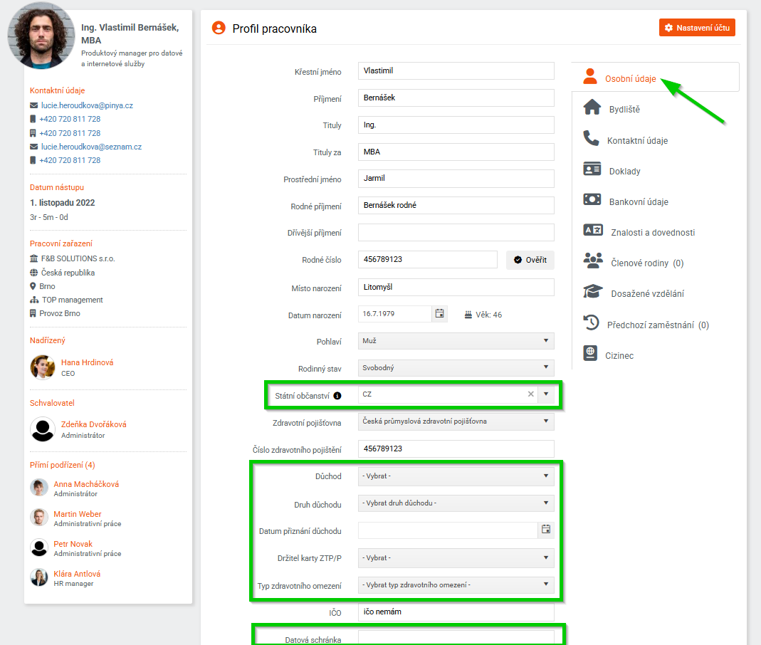 záložka Osobní údaje
