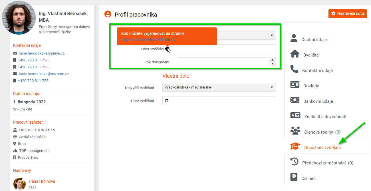 záložka Dosažené vzdělání