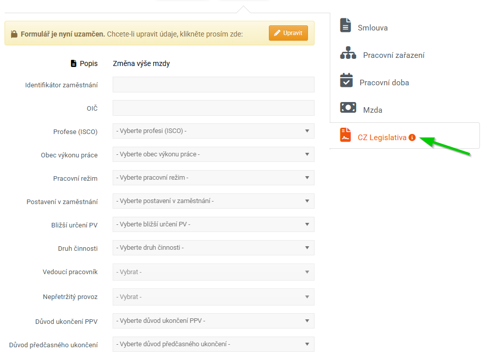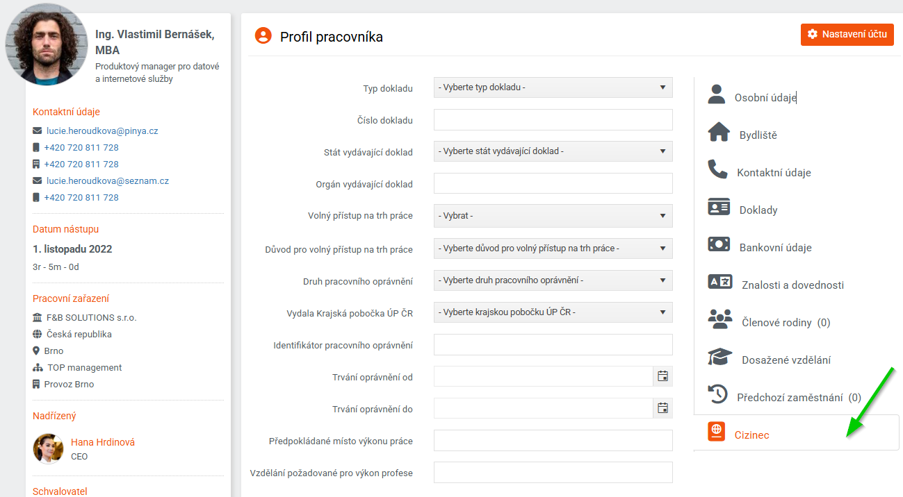 Sekce Pracovní údaje