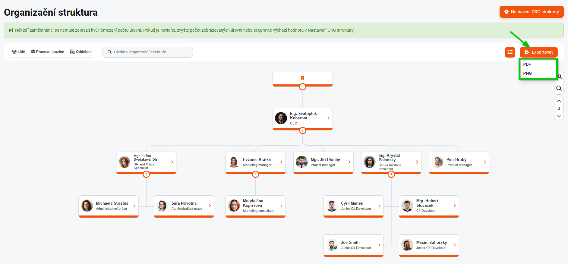 Pomocí tlačítka Exportovat můžete snadno uložit aktuální zobrazení organizační struktury.