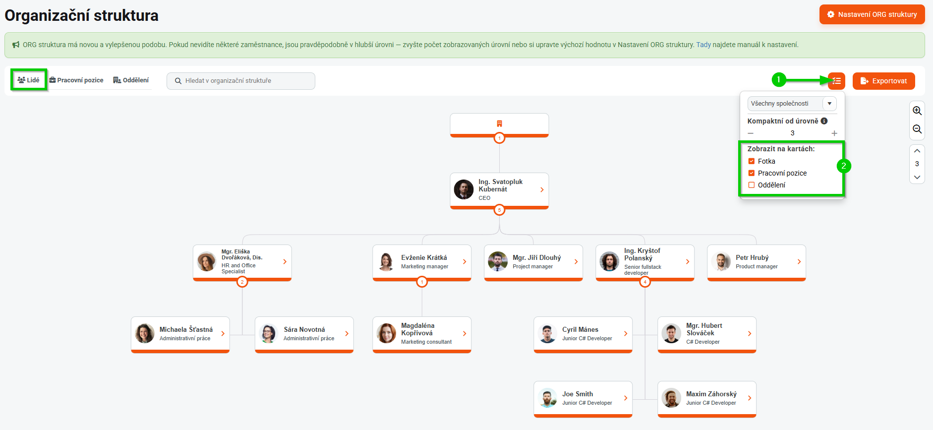 ORG struktura zobrazuje přehled všech oddělení a jejich členů.