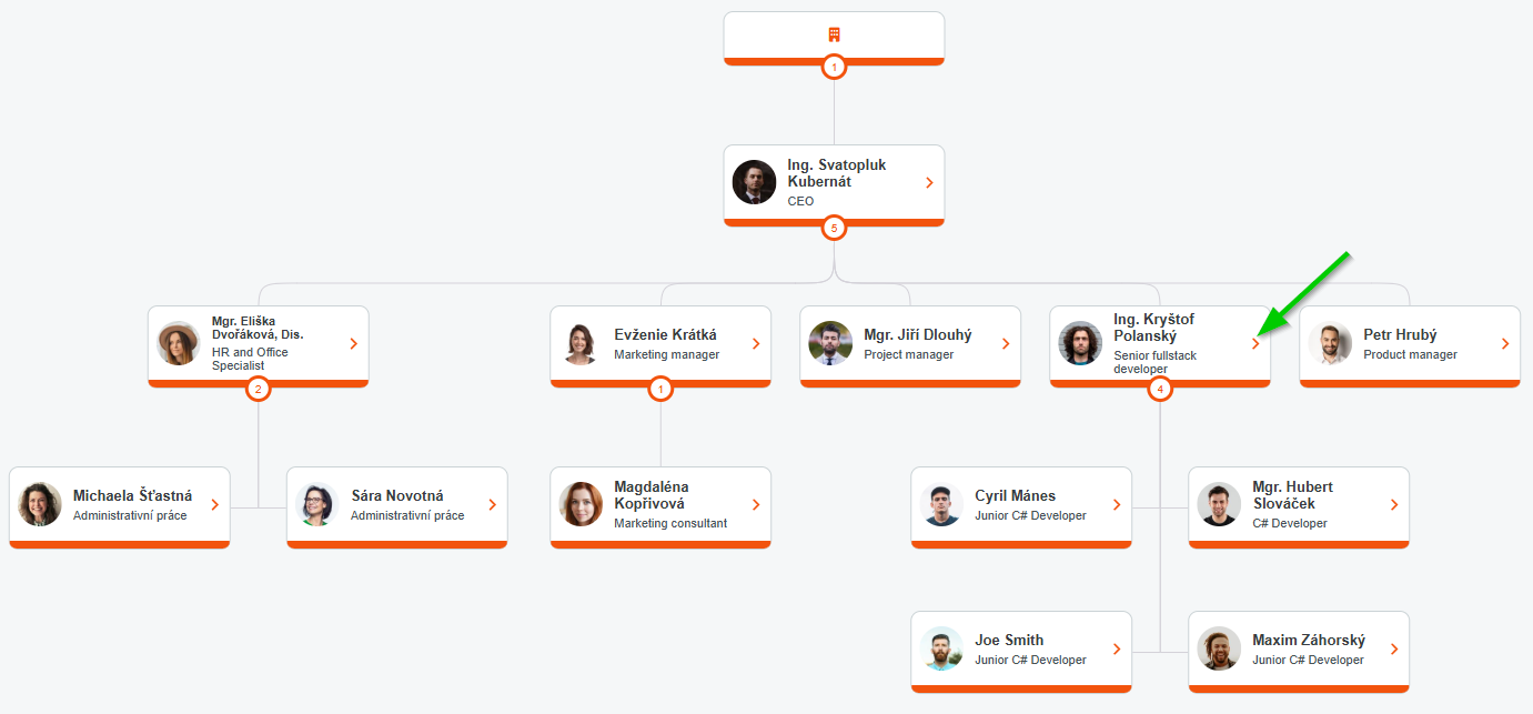 Na kartách u každého manažera si kliknutím na šipku zobrazíte celý jeho tým.