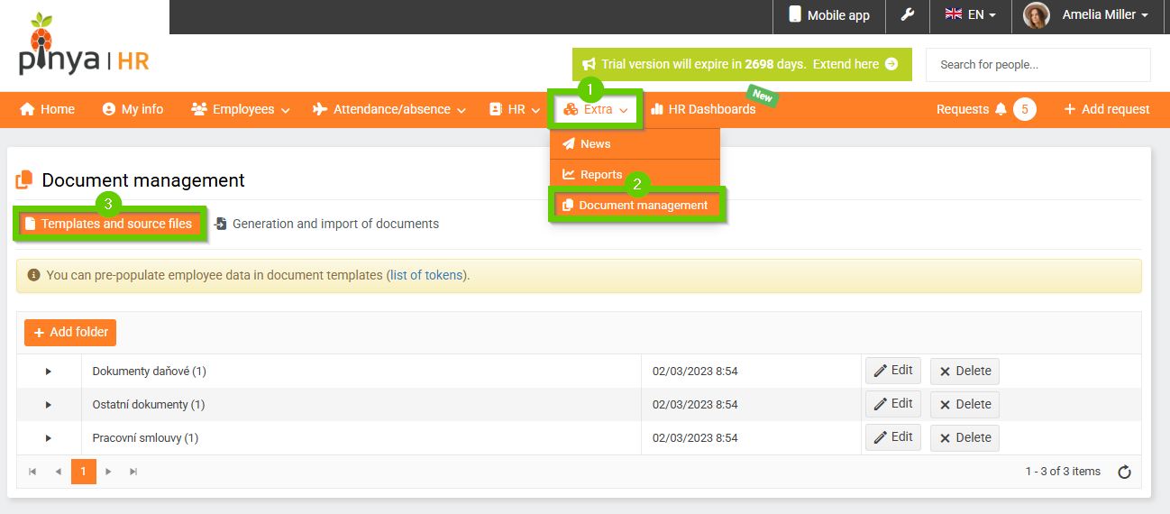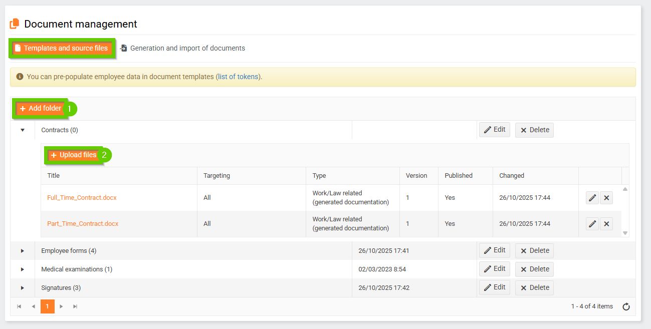 On the Templates and source files tab, you can create folders and insert the relevant document templates into them. To create a new folder, click the Add folder button (1). After selecting a folder, you can upload prepared documents - the Upload files button (2).