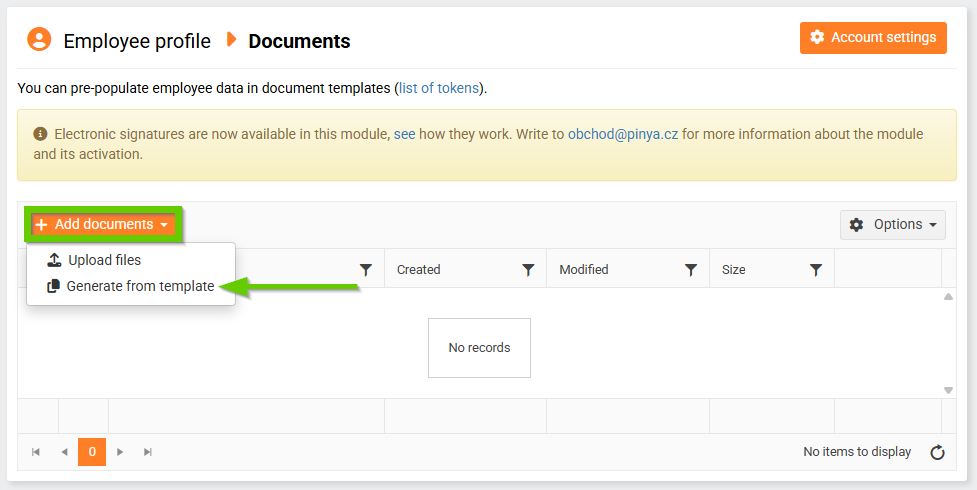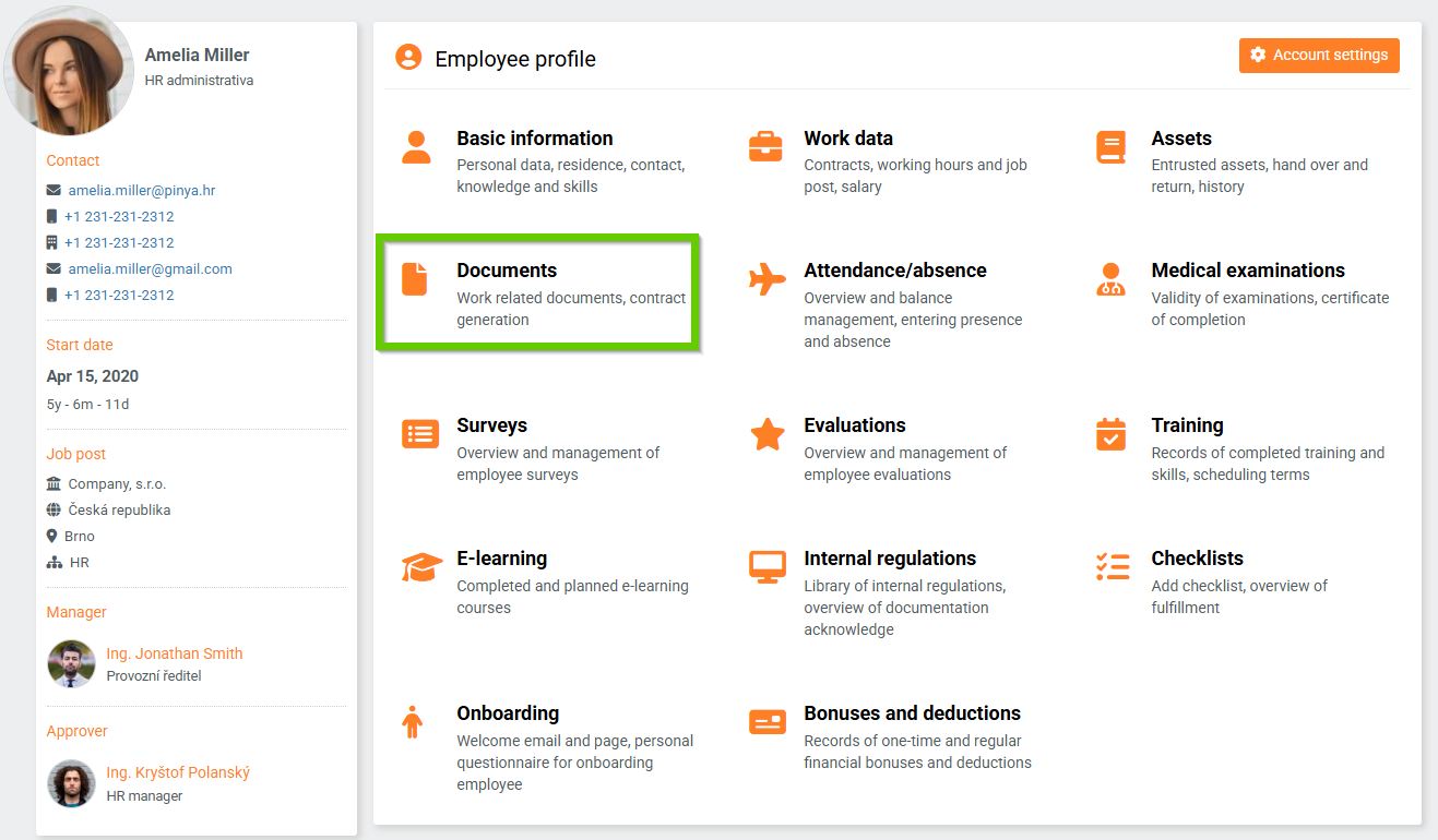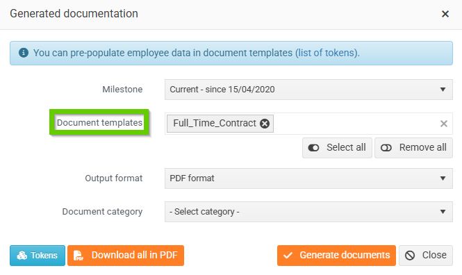Select the documents you want to generate, choose the output format, and select the category in the employee’s profile where the generated document will be saved.
