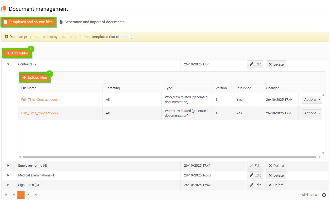 On the Templates and source files tab, you can create folders and insert the relevant document templates into them. To create a new folder, click the Add folder button (1). After clicking on the folder, you can upload prepared documents - the Upload files button (2).