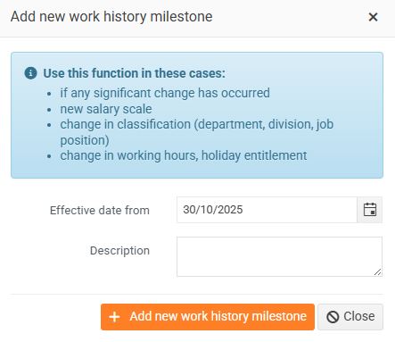 - You will most often create a new milestone when an amendment to an employment contract or a new wage statement is issued, but you can record any change in work data in a separate milestone. Milestones can also be added retrospectively.