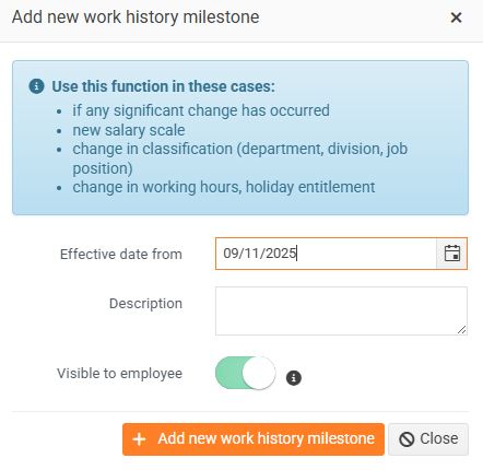 If you are planning any changes for an employee in the future (such as a salary increase), you can set up a future milestone . You don't have to worry about manually updating the data on the day of the change, the milestone will automatically be set as current on that day.