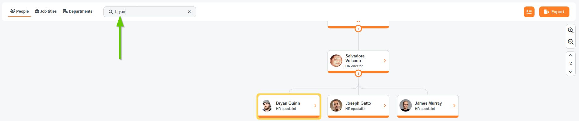 Search will highlight in yellow all records that contain the entered text. Just enter part of the first/last name, job title, or department, and all matches will be displayed directly in the structure.
