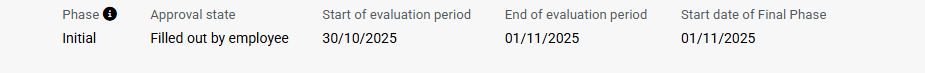 - The middle section displays information about the phase and approval status , the period for which the evaluation is being completed, and the date when the Final Phase will begin .