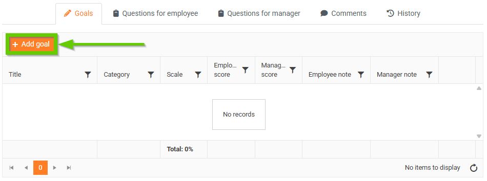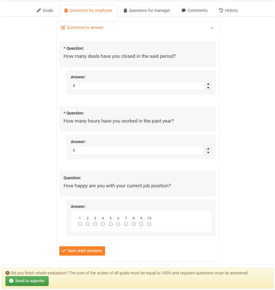 - The lower part of the evaluation always contains evaluation questions for you and your supervisor, comments from those involved, and history . If the evaluation includes goals , you will also see the Goals tab here for setting them.