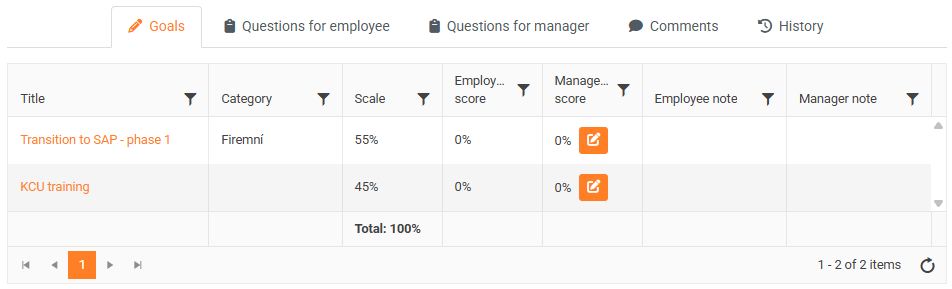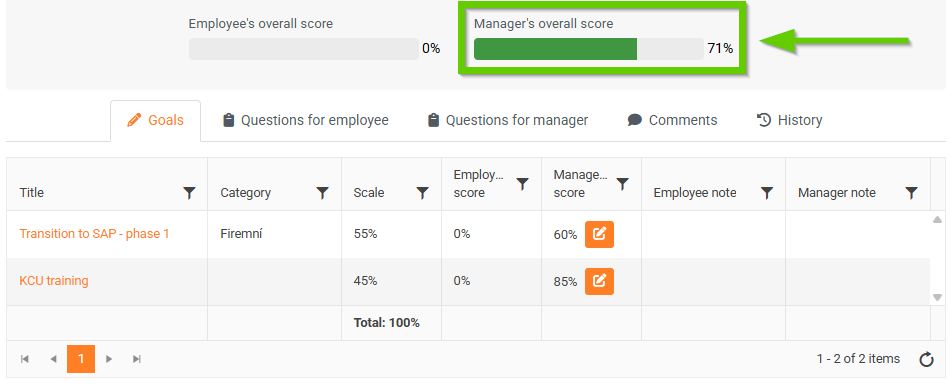 - The ongoing achievement of goals, calculated according to individual weights, is displayed graphically in the middle part of the evaluation form.