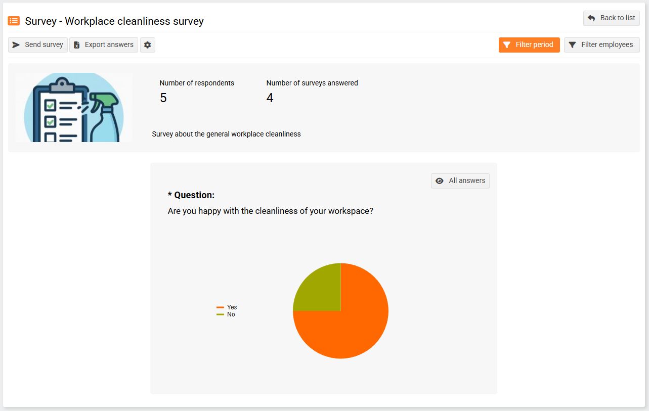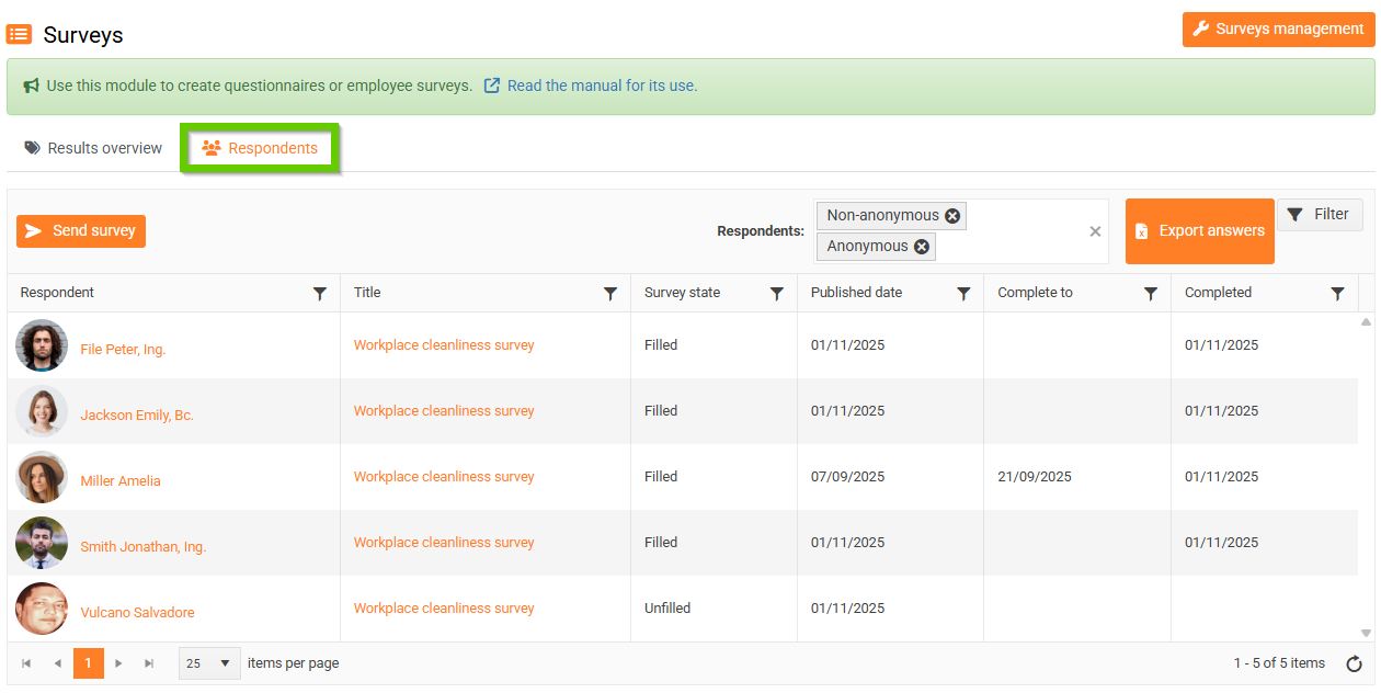After opening the Surveys module, you’ll see an overview of all created surveys.
