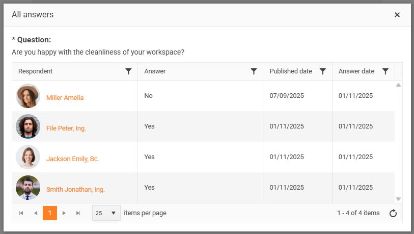 This view shows the question, respondent list, each answer, survey publication date, and response date.