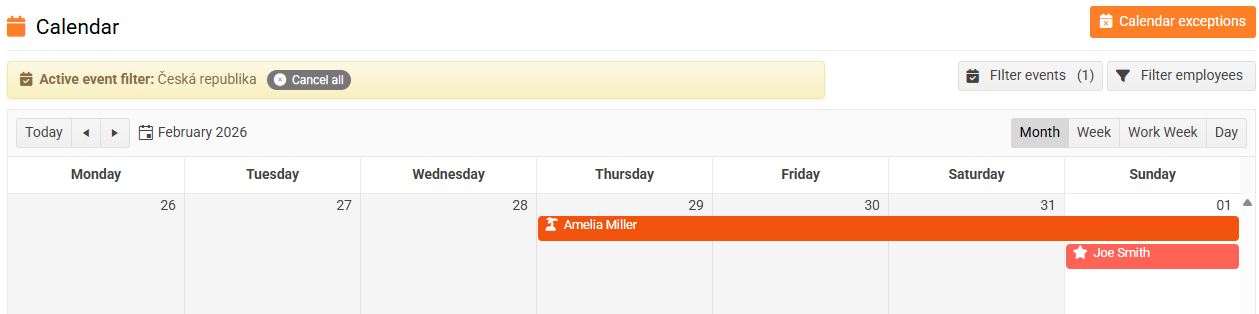 If you want to add exceptions to your calendar (e.g., public holidays, extra working days), you can do so by setting the calendar in the Attendance/absence > Calendar menu - Calendar exceptions button.