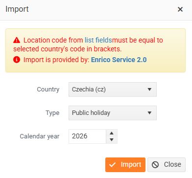 Public holidays can be imported into the calendar in bulk using the Import button. Select the country and year for which you want to import public holidays.
