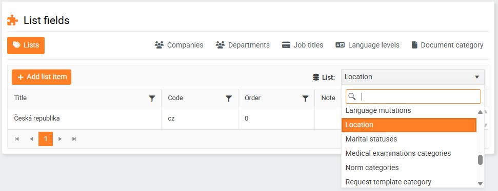 To set up list fields, go to the main system settings - you'll find them under the wrench symbol in the top black bar. In the left panel, select List fields, and in the drop-down list on the right, select Location. Add the code you found in the calendar exceptions list to the desired country.