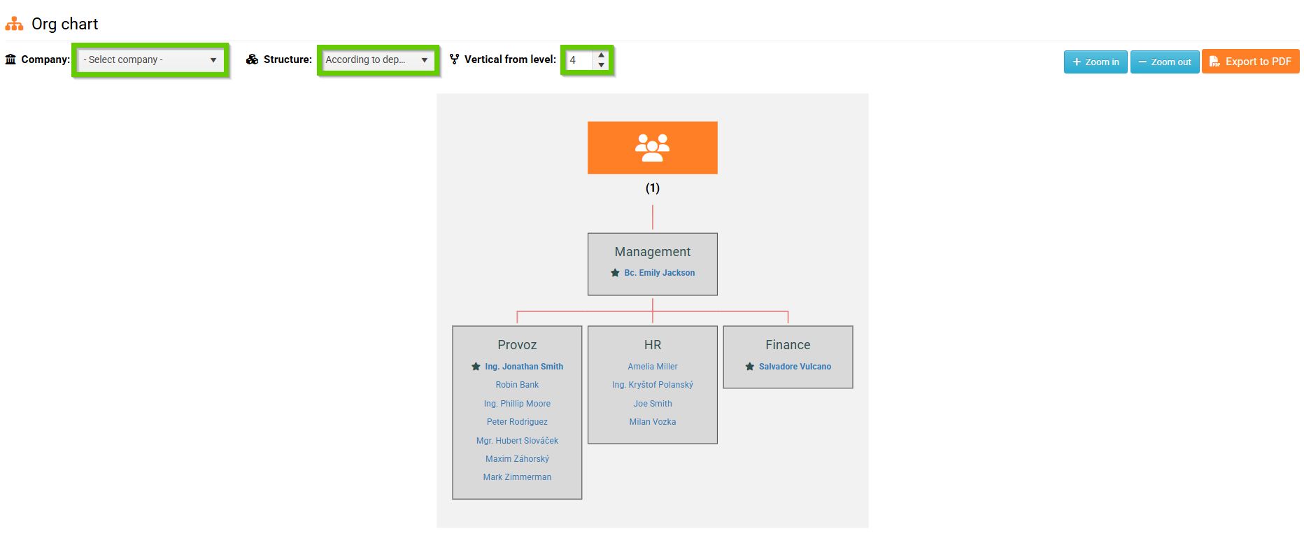 In the organizational structure, you can filter by company, choose how you want to view the structure, or zoom in and out on the entire structure.