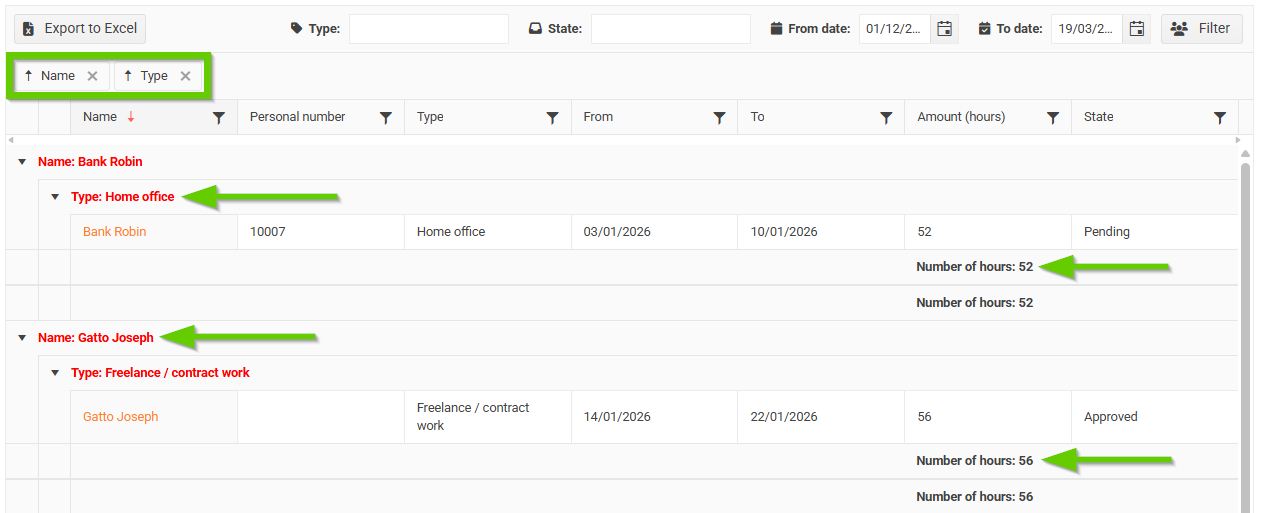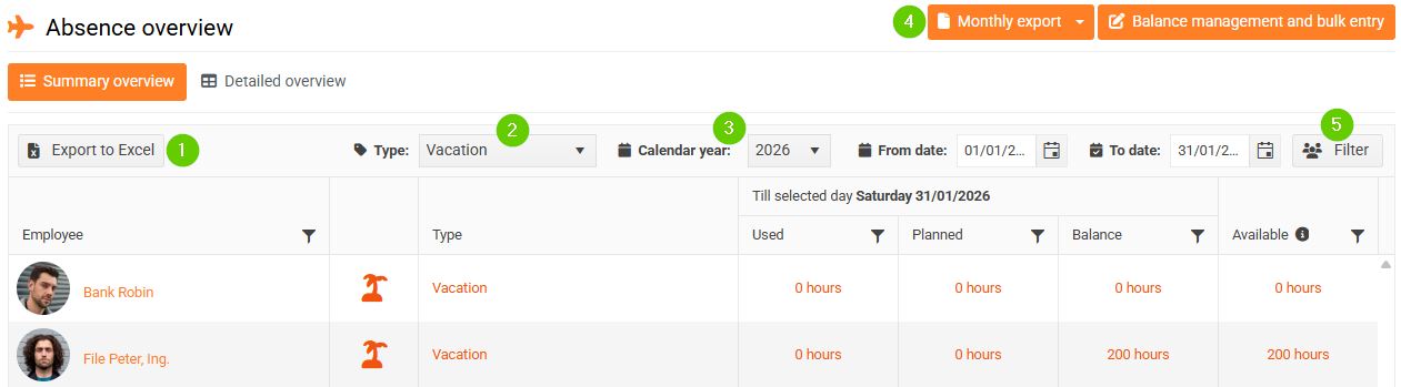 - Export to Excel (1) = export attendance/absence overview to Excel