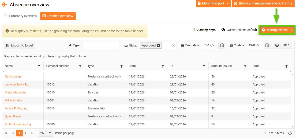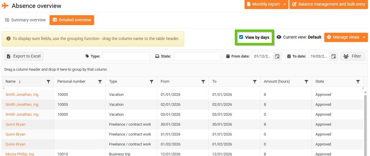 You can switch the entire overview to a daily view using the Show by days checkbox. This will spread an employee's absence of several days across several lines.
