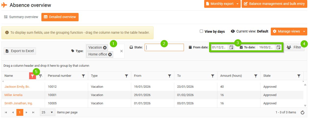- Filters in the overview header (5) – using the column header filter, only one value can be filtered at a time