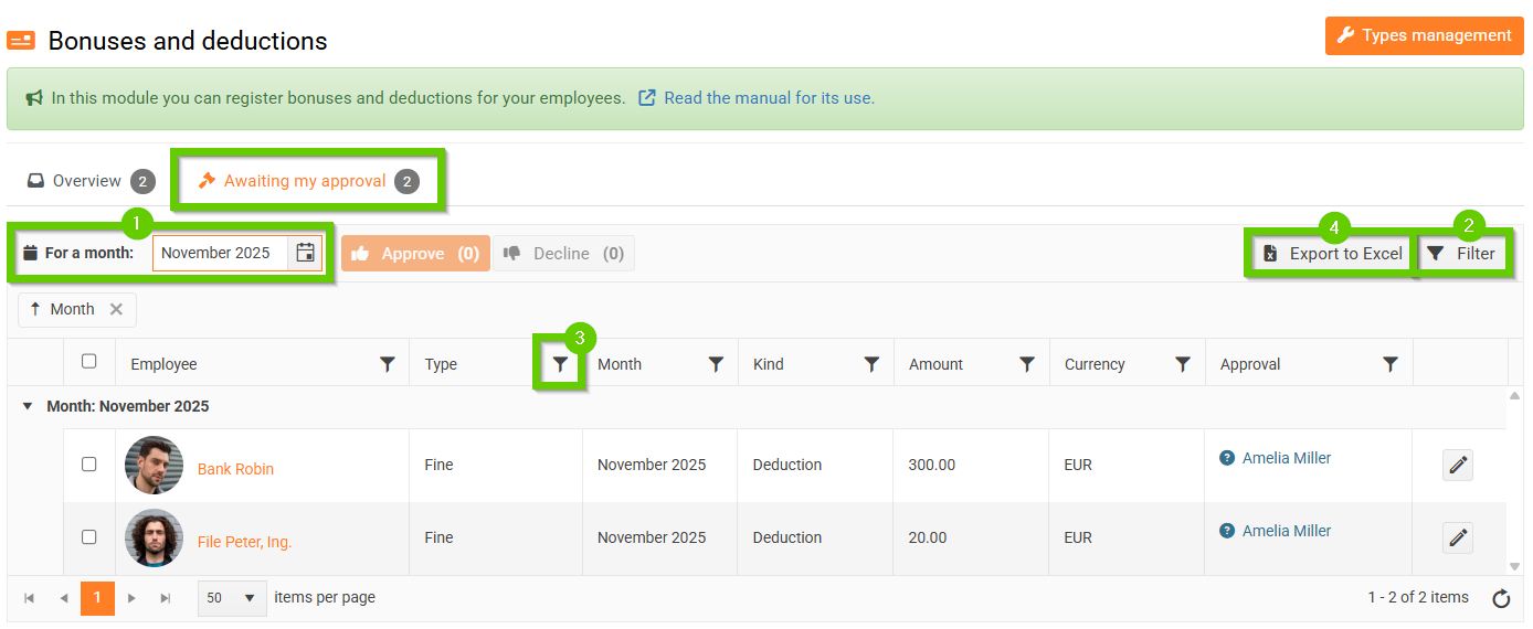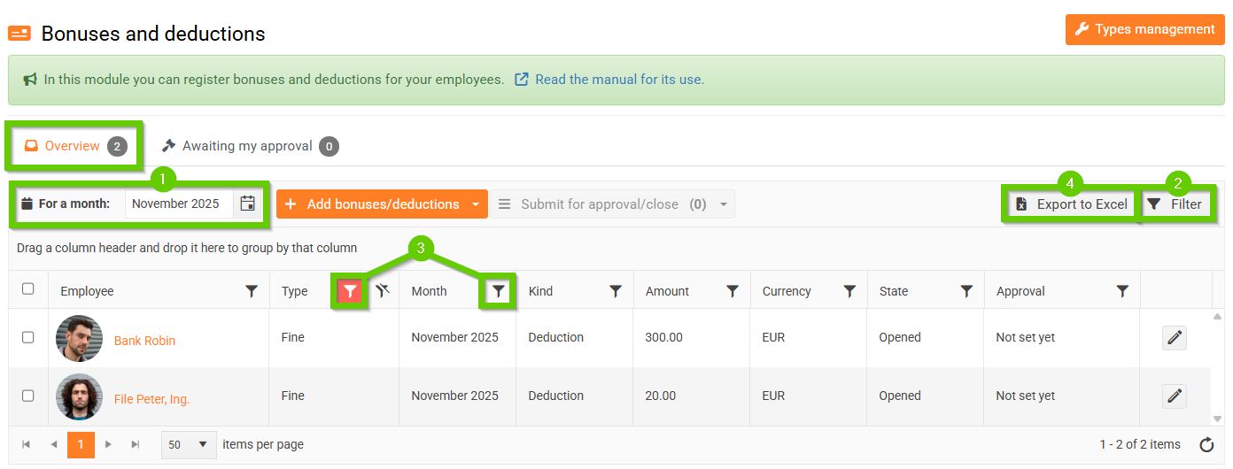 The overview of bonuses and deductions is displayed for the current month by default. Using the calendar (1), you can view bonuses and deductions for both past and future months.