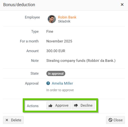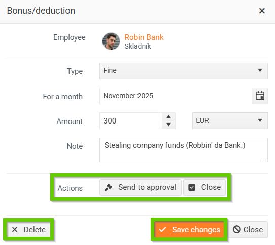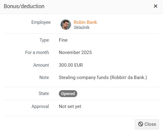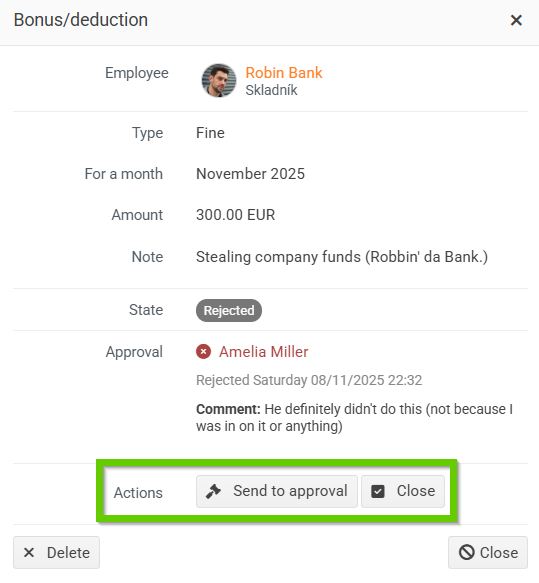 - If the bonus/deduction has not yet been sent for approval , you can make the required adjustments on the detail. You can also perform actions on the detail: Send for approval and Close. Alternatively, you can delete the record here.