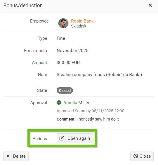 - If the bonus/deduction has already been approved by all approvers , it can be reopened. After opening, changes and actions can be made to the detail.