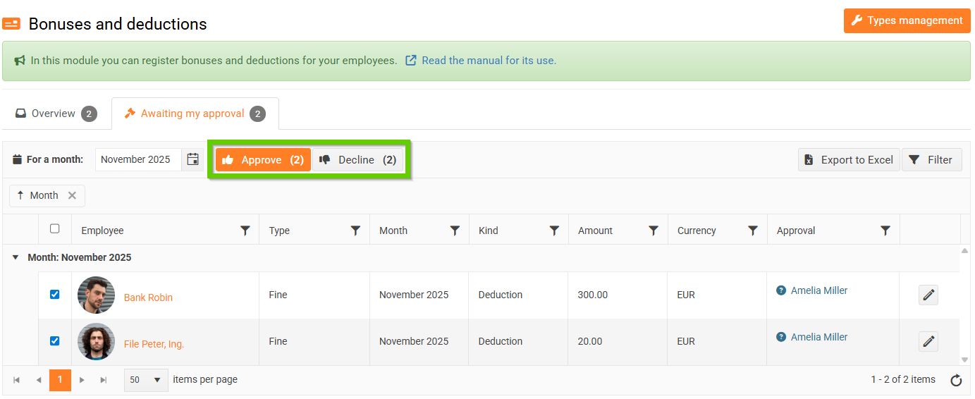Only bonuses that are awaiting approval by the currently logged in user are displayed here.