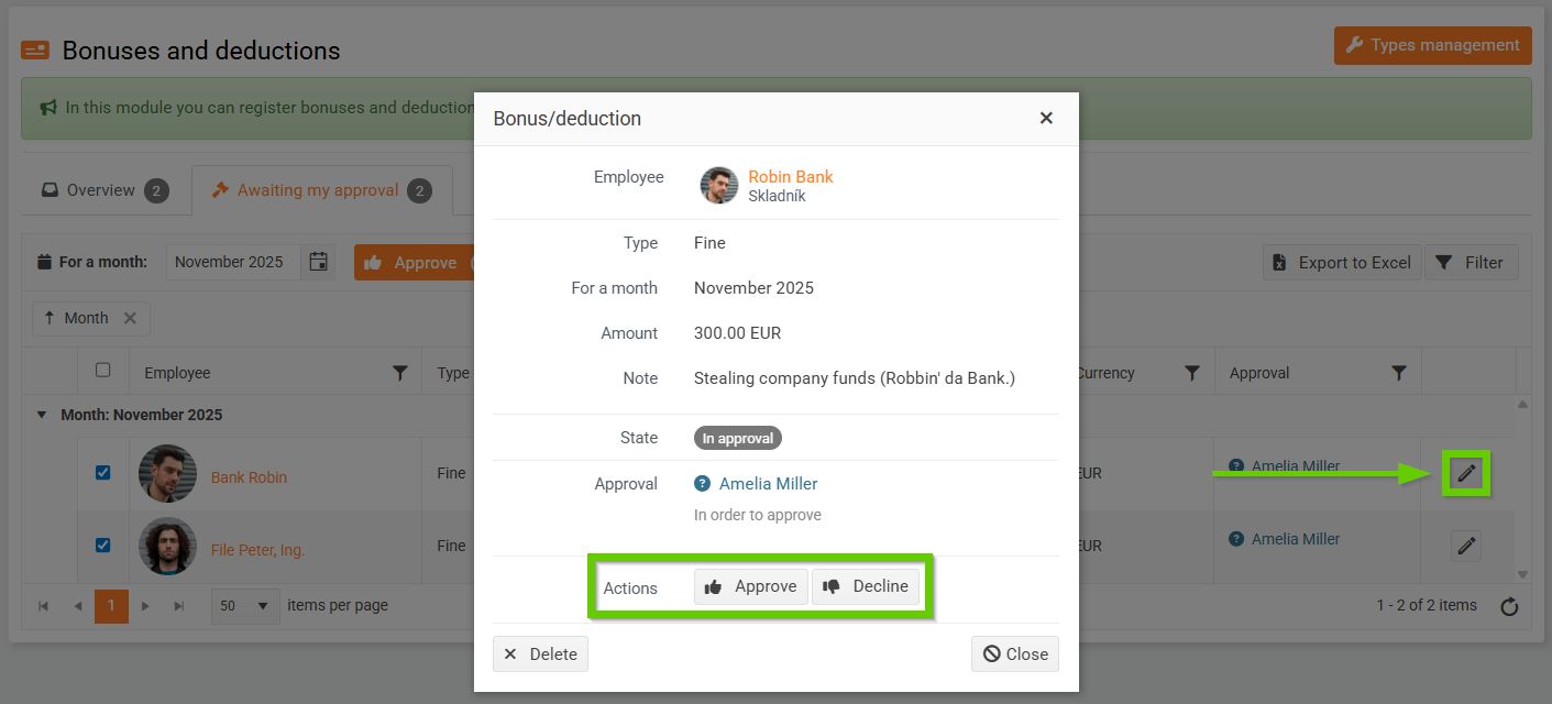 Clicking the pencil icon to open the details of the selected record. Here you can either approve or reject the selected bonus/deduction.