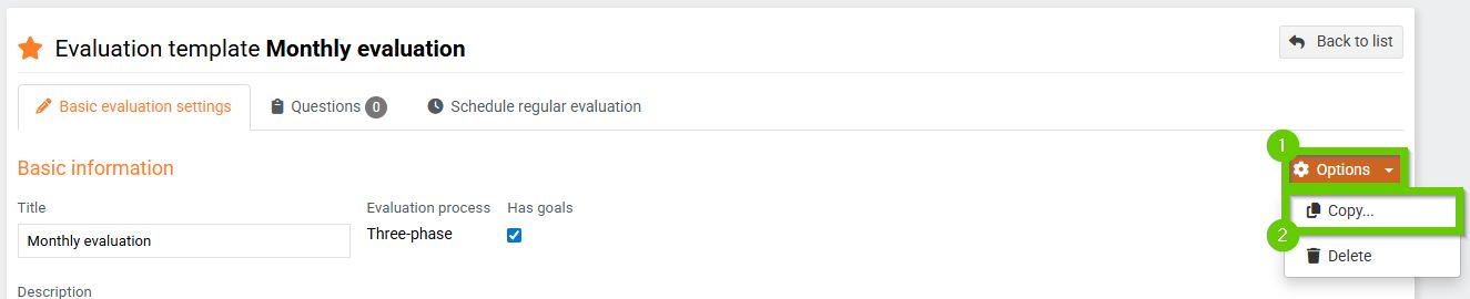 You can edit, copy, or delete existing evaluation templates.