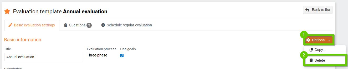 - You can edit the basic Evaluation Settings , Questions , and Scheduled evaluation publishing .